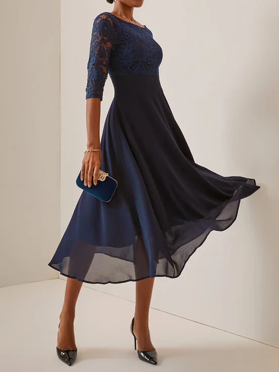 Purplish blue Lace Chiffon Crew Neck Half Sleeve A-Line Midi Mother of the Bride or Groom Dress