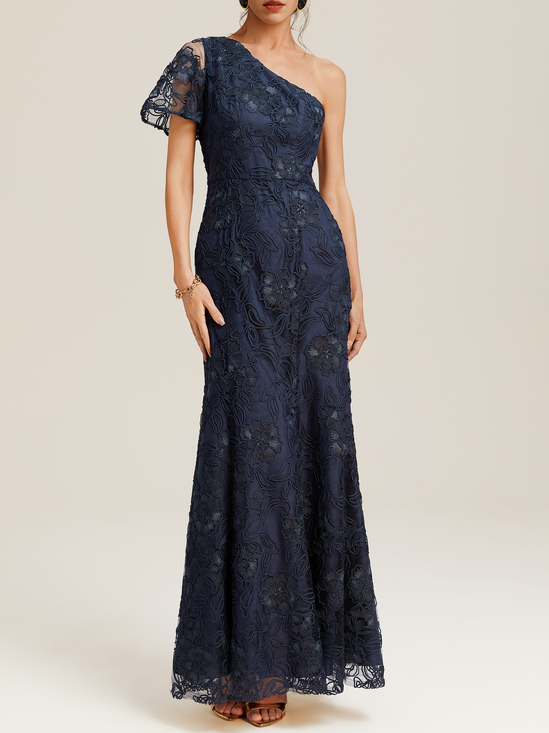 Black Jacquard Lace One Shoulder Long Sleeve Mermaid Maxi Dress