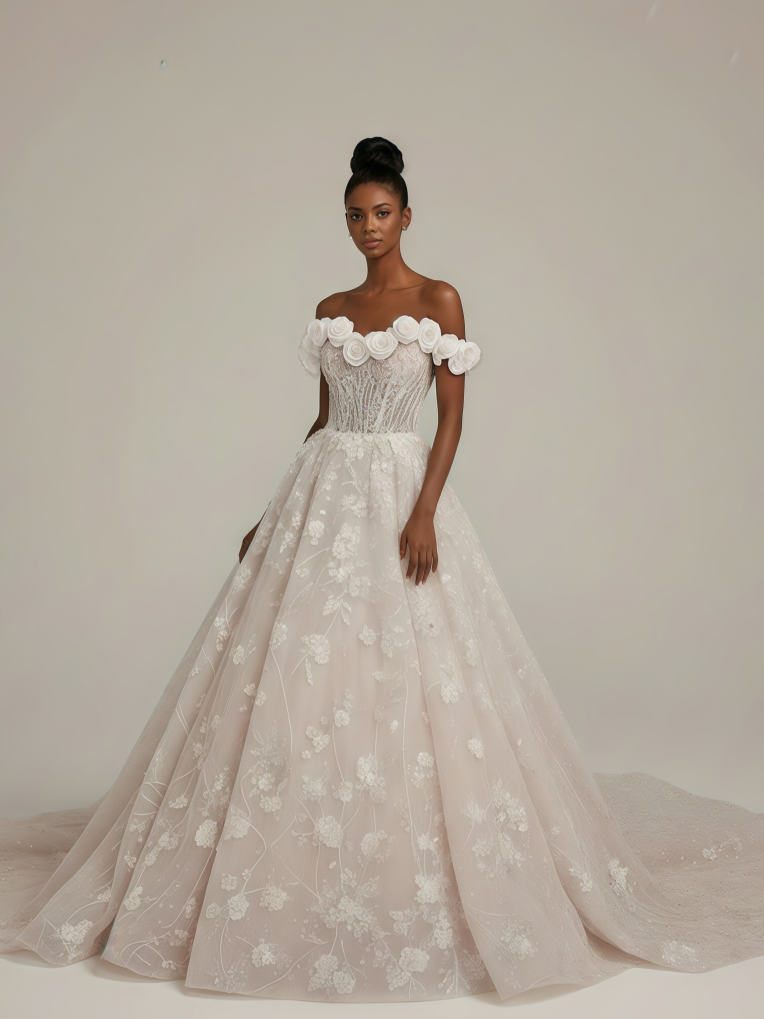 A-Line Off The Shoulder Sleeveless 3D Floral Gown Luxury Bridal Dress