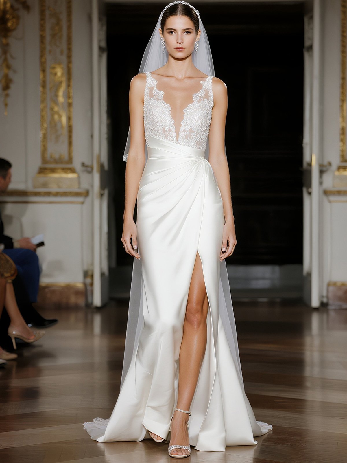 All Season White V Neck Sleeveless Lace Side-Slit Gown Wedding Dress