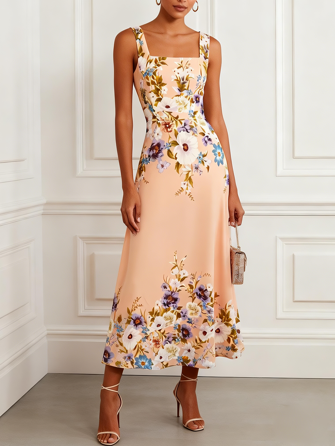 Apricot Floral Chiffon Square Neck Sleeveless A-Line Maxi Dress