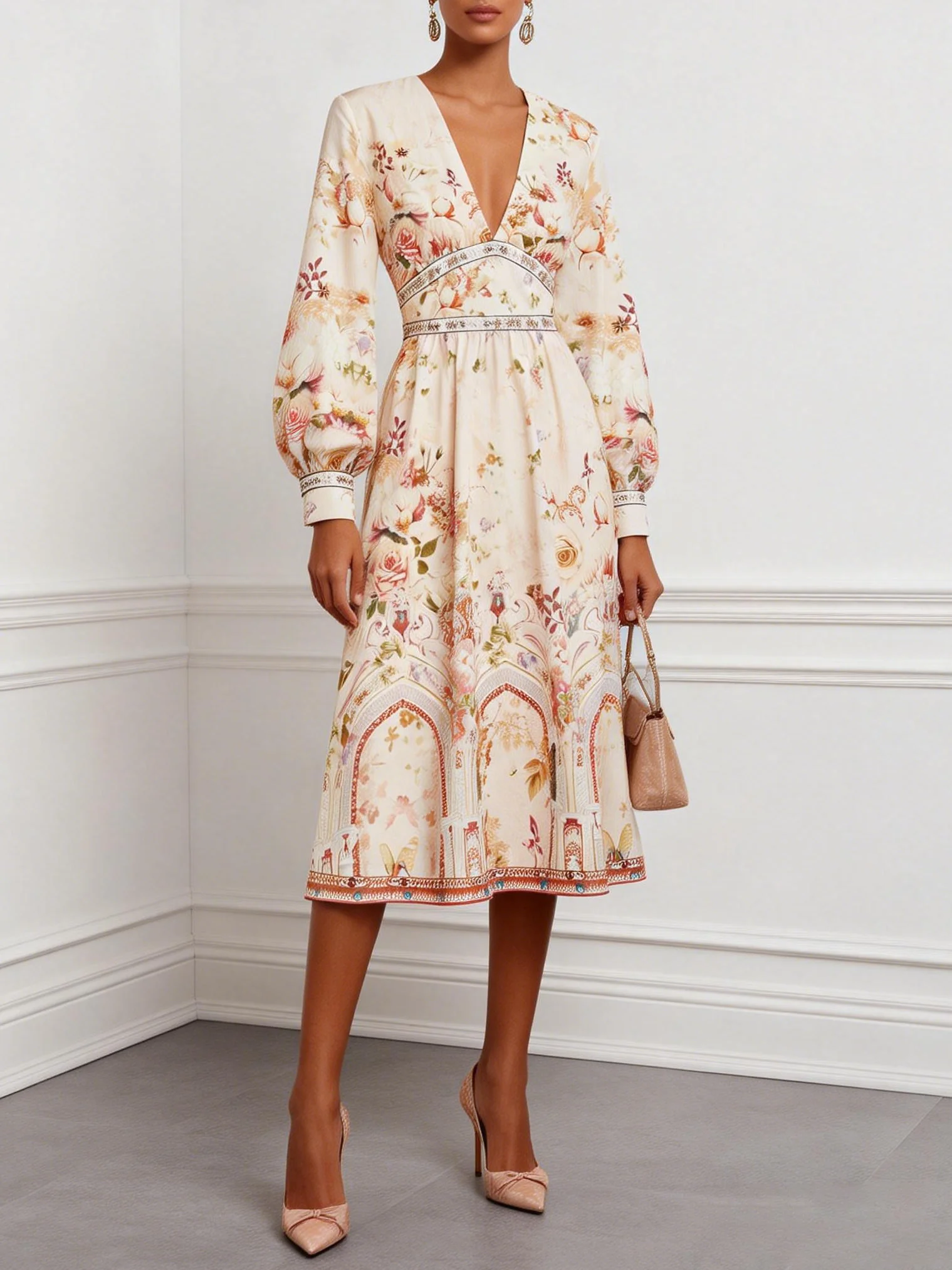 Apricot Floral Ruched Classic V Neck Long Sleeve Puff Sleeve A-Line Midi Dress