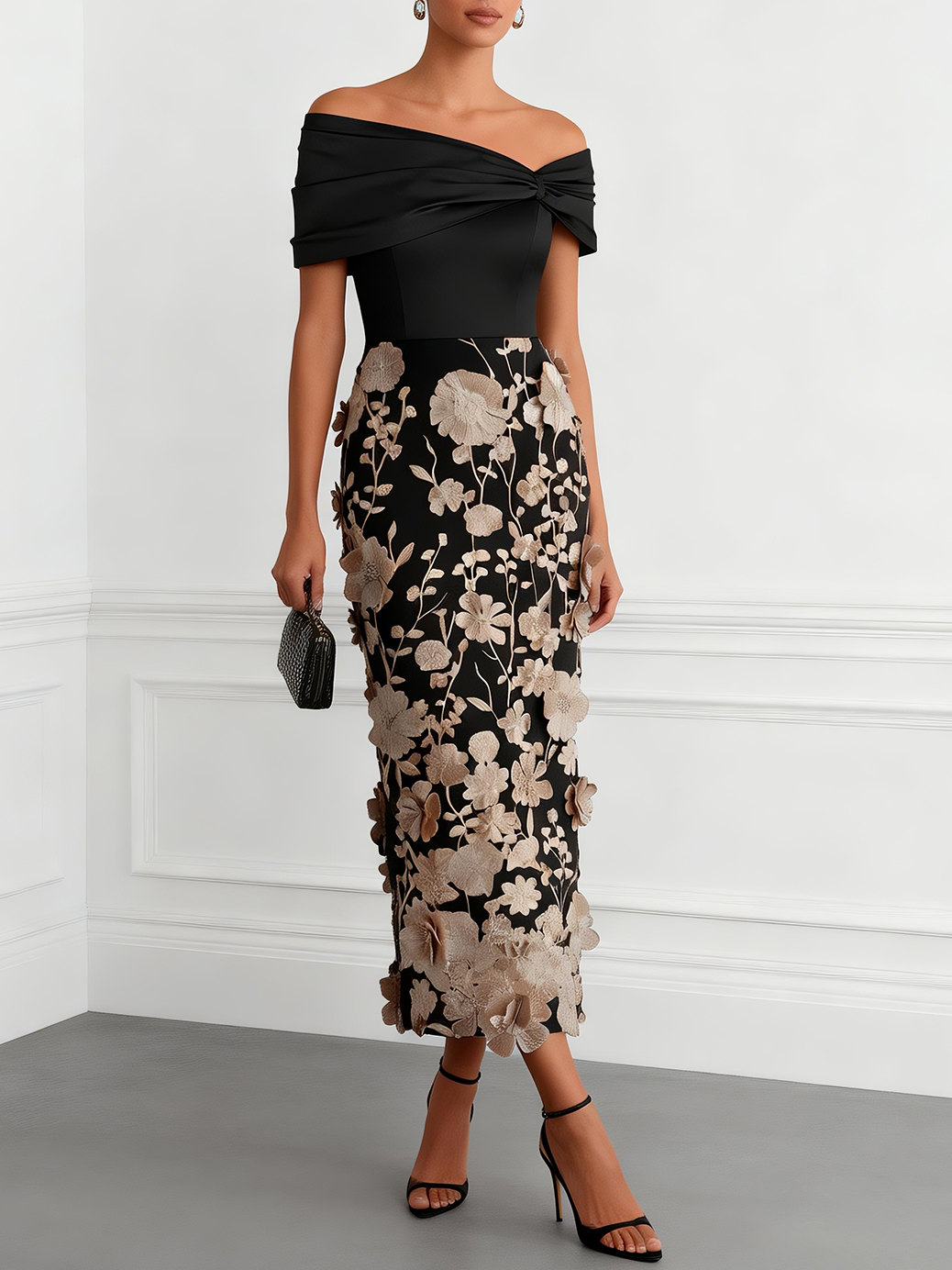Black 3D Floral Classic Off The Shoulder Short Sleeve Sheath Midi Dress