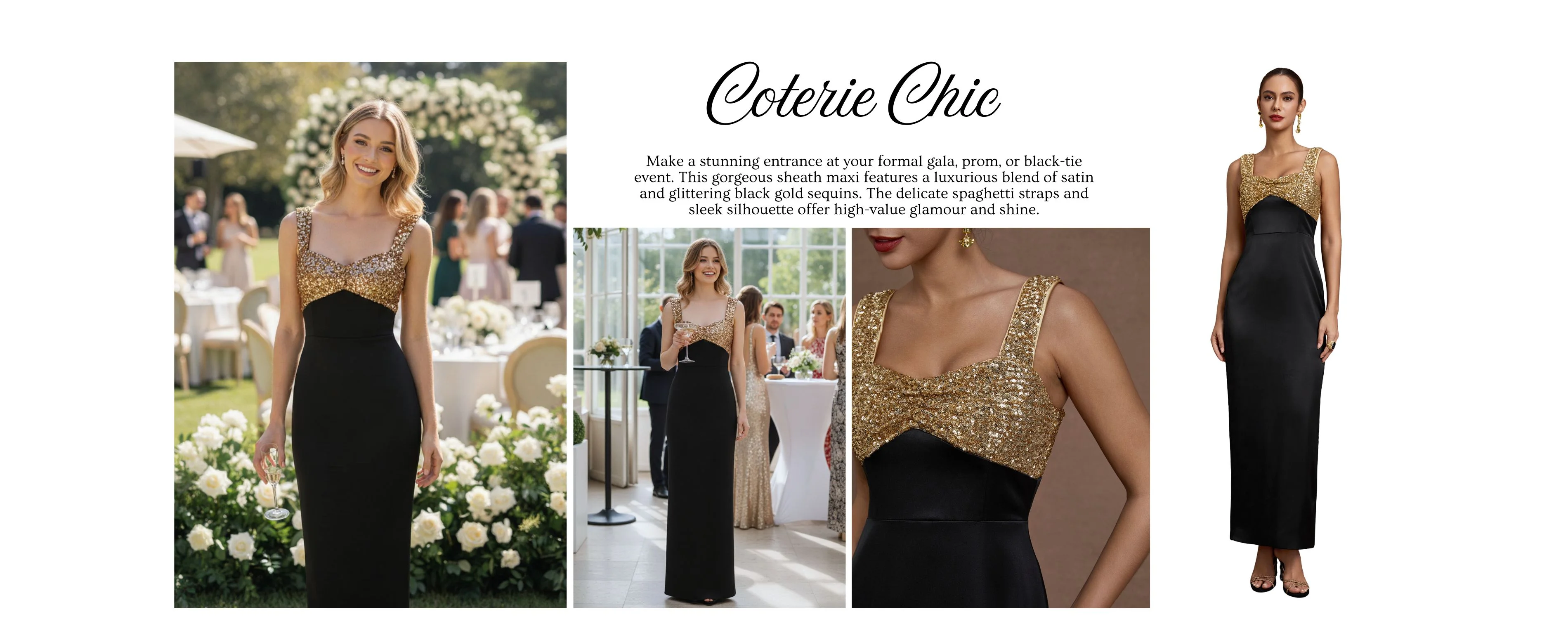 Make a stunning entrance at your formal gala, prom, or black-tie event. This gorgeous sheath maxi features a luxurious blend of satin and glittering Black Gold sequins. The delicate spaghetti straps and sleek silhouette offer high-value glamour and shine.