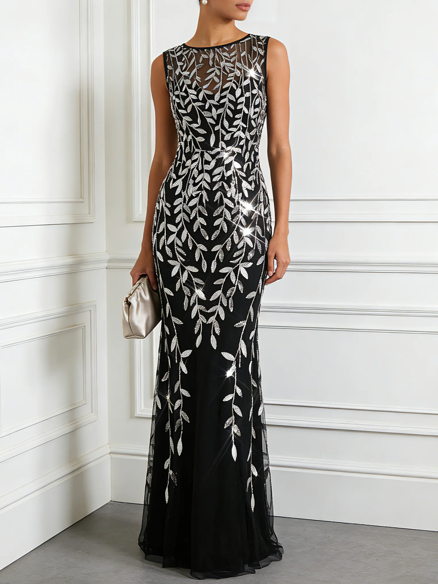 Black Sequin Boat Neck Sleeveless Mermaid Floor-length Gown Dress