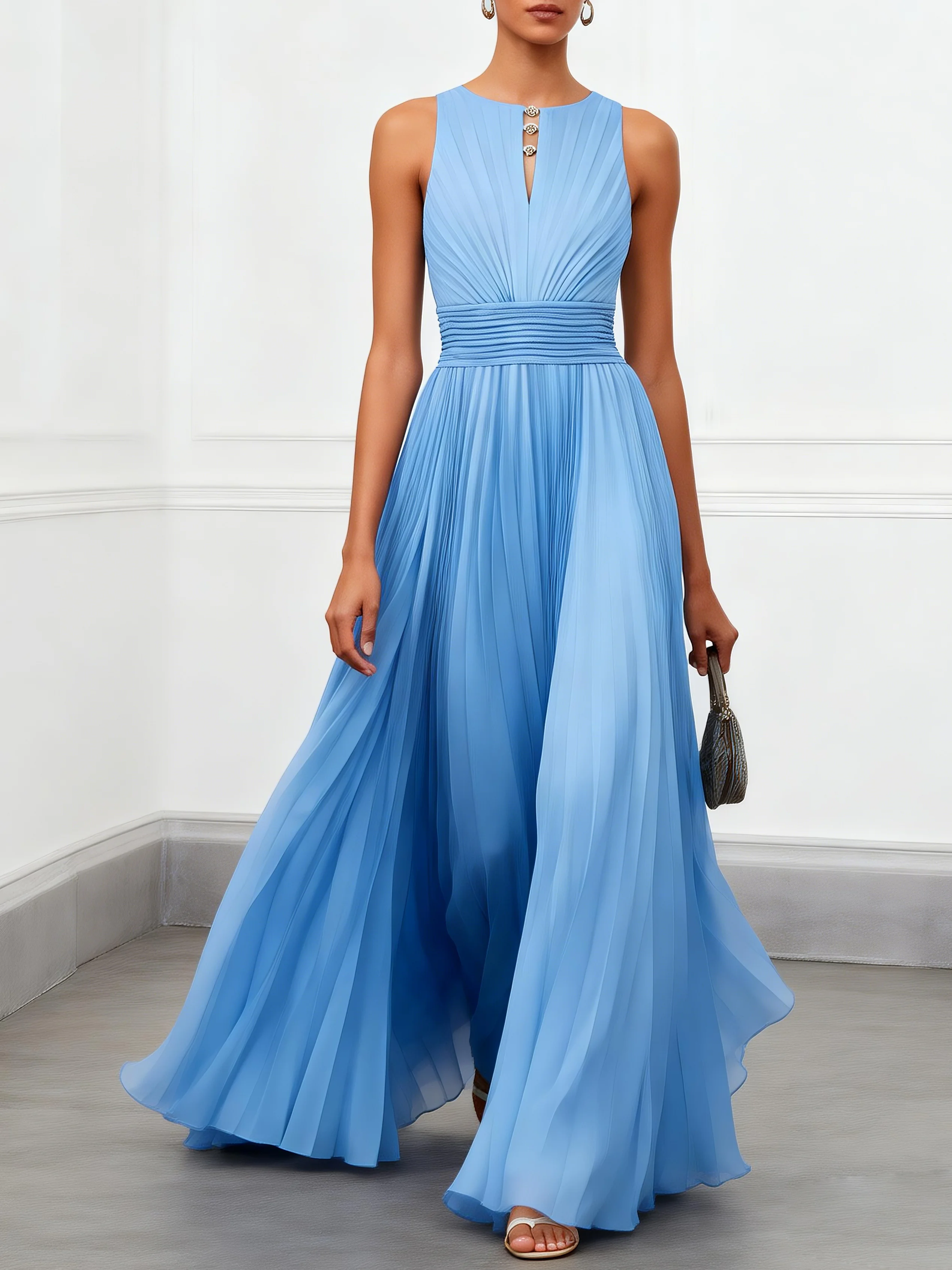Blue Pleated Rhinestone Chiffon Crew Neck Sleeveless A-Line Floor-length Gown Dress