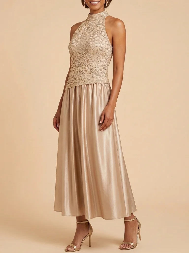 Elegant champagne mother of the bride dress featuring a lace bodice, halter neckline, and flowing satin maxi skirt. Perfect for weddings and formal events.
