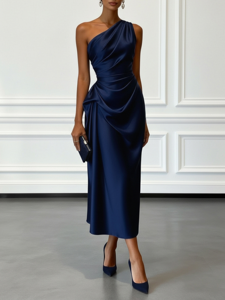 Radiate effortless luxury at cocktail parties, rehearsal dinners, or upscale holiday events. This sophisticated sleeveless sheath dress features a modern one-shoulder neckline and intricate ruched detailing that creates a seamless, figure-sculpting fit.