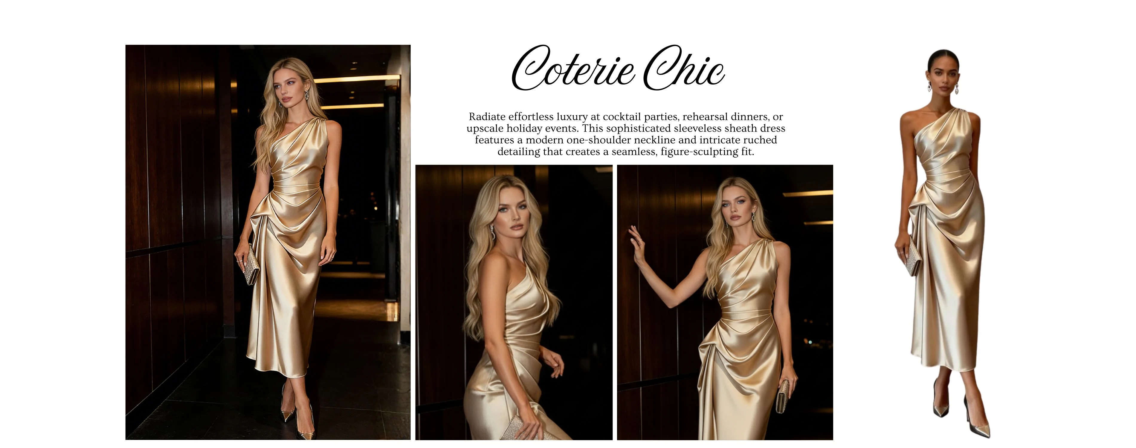 Radiate effortless luxury at cocktail parties, rehearsal dinners, or upscale holiday events. This sophisticated sleeveless sheath dress features a modern one-shoulder neckline and intricate ruched detailing that creates a seamless, figure-sculpting fit.