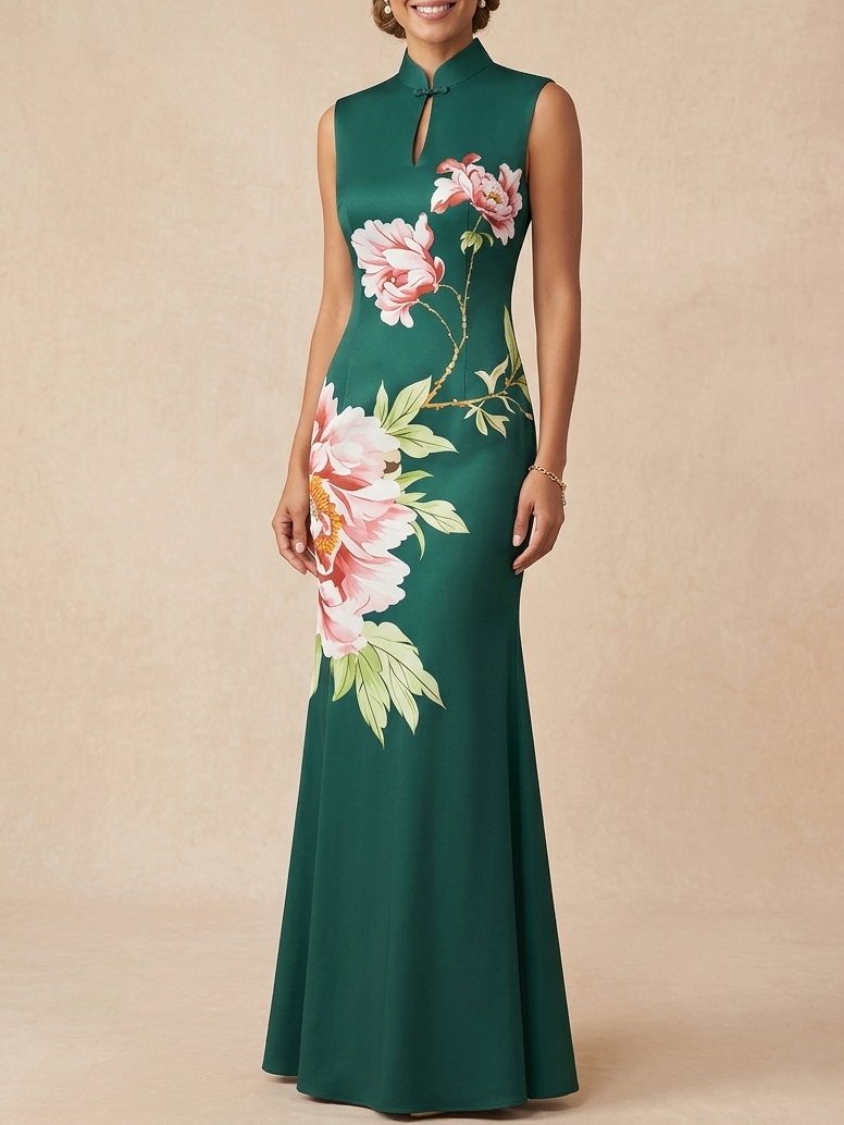 Exude timeless elegance in this dark green maxi dress. Perfect for the Mother of the Bride, it features a sleeveless cheongsam collar and vibrant floral details. A sophisticated blend of vintage charm and modern grace for your special day.