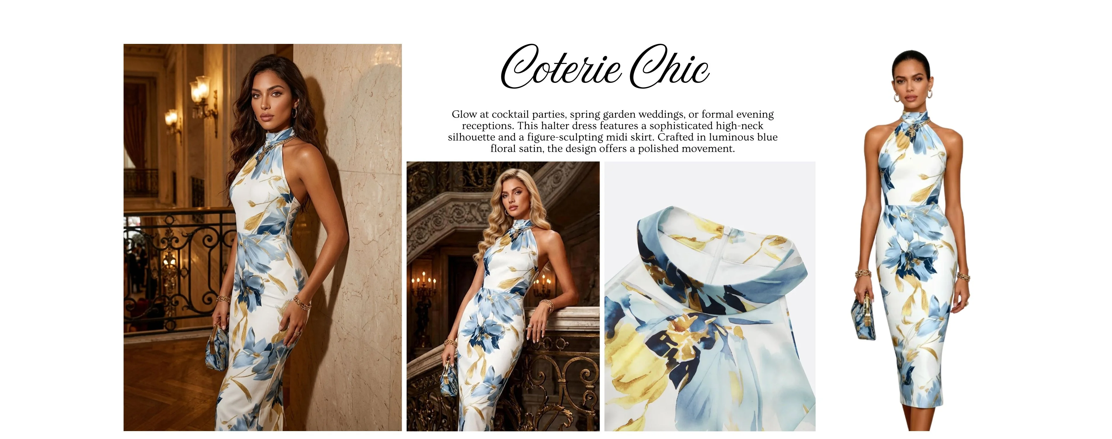 Glow at cocktail parties, spring garden weddings, or formal evening receptions. This halter dress features a sophisticated high-neck silhouette and a figure-sculpting midi skirt. Crafted in luminous blue floral satin, the design offers a polished movement.