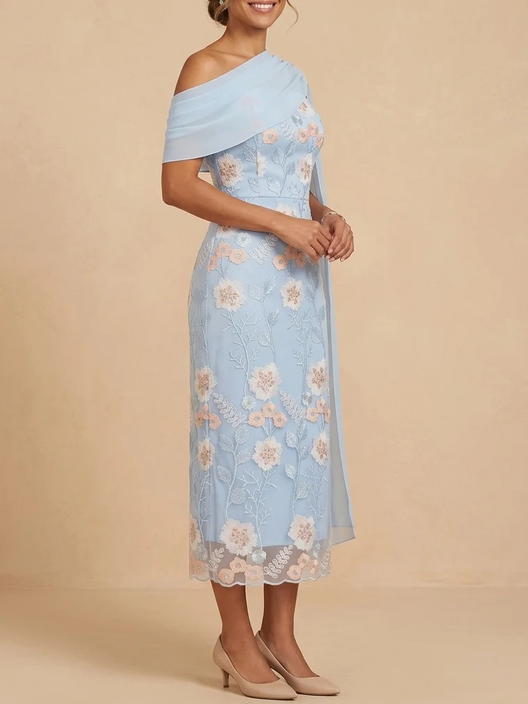 This light blue mother of the bride dress features floral embroidered lace and a flowing chiffon cape overlay. The elegant design offers graceful coverage and a refined silhouette, perfect for weddings, formal events, and special occasions.
