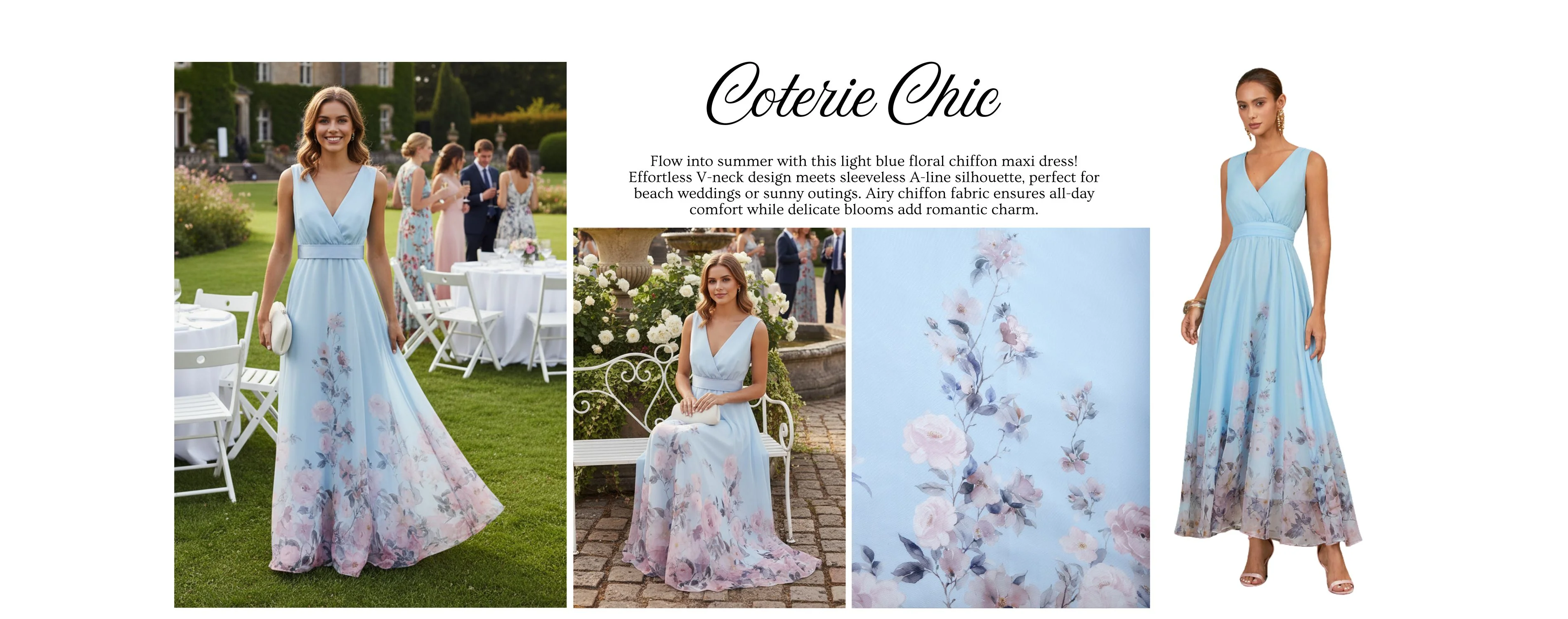 Flow into summer with this light blue floral chiffon maxi dress! Effortless V-neck design meets sleeveless A-line silhouette, perfect for beach weddings or sunny outings. Airy chiffon fabric ensures all-day comfort while delicate blooms add romantic charm.