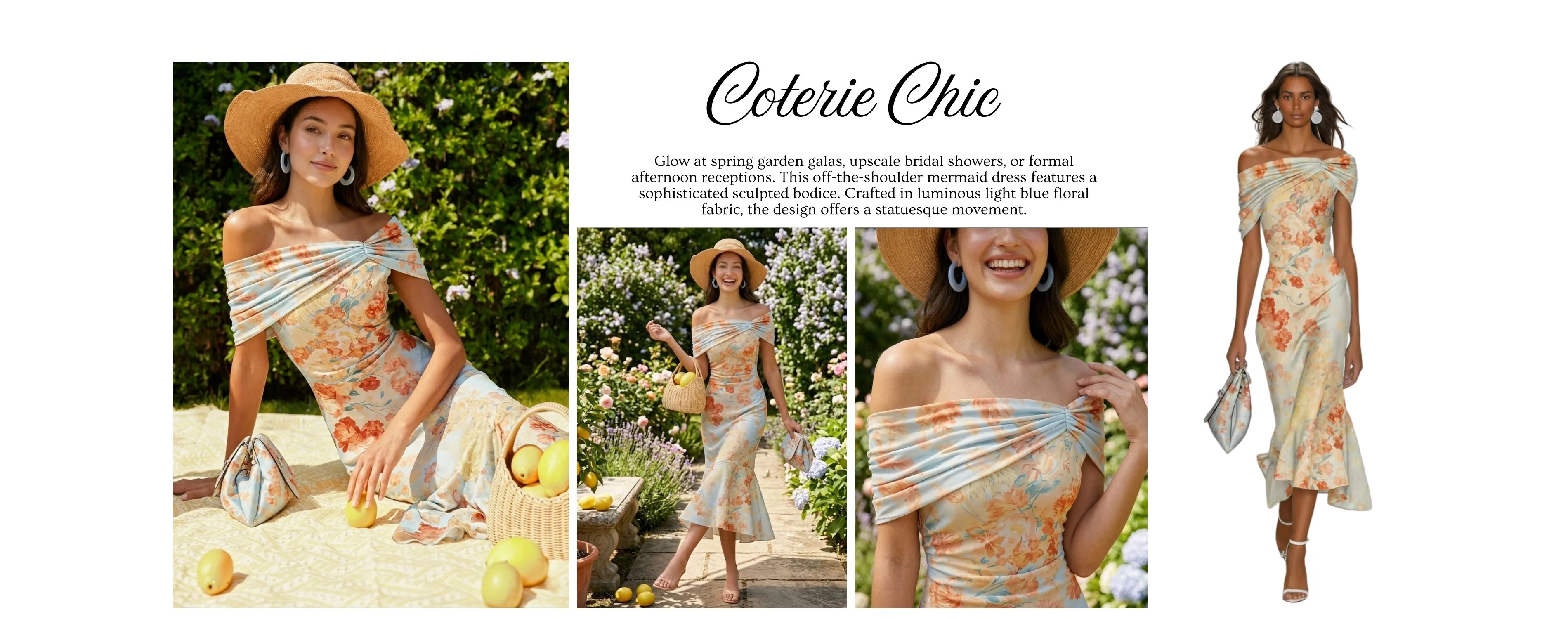 Glow at spring garden galas, upscale bridal showers, or formal afternoon receptions. This off-the-shoulder mermaid dress features a sophisticated sculpted bodice. Crafted in luminous light blue floral fabric, the design offers a statuesque movement.