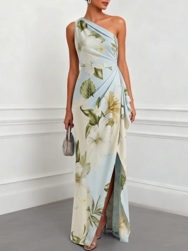 Glow at spring garden weddings, upscale bridal showers, or formal afternoon tea events. This one shoulder sheath dress features a figure-sculpting skirt. Crafted in luminous light blue floral fabric, the design offers a polished and statuesque movement.