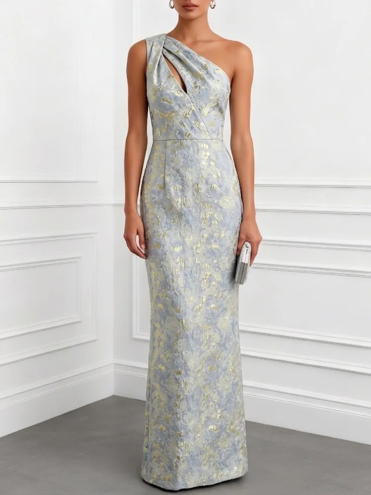Light Blue Jacquard Classic One Shoulder Sleeveless Sheath Floor-length Gown Dress