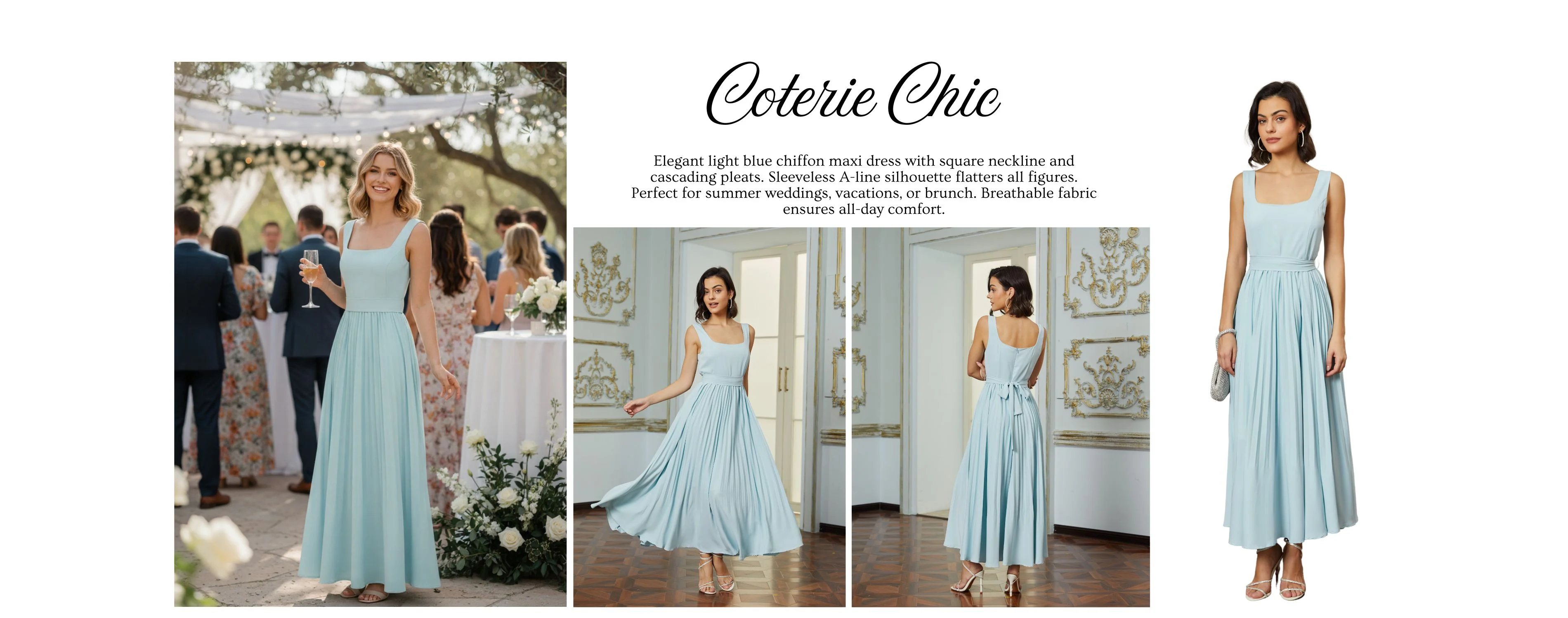 Elegant Light Blue Chiffon Maxi Dress with square neckline and cascading pleats. Sleeveless A-line silhouette flatters all figures. Perfect for summer weddings, vacations, or brunch. Breathable fabric ensures all-day comfort.