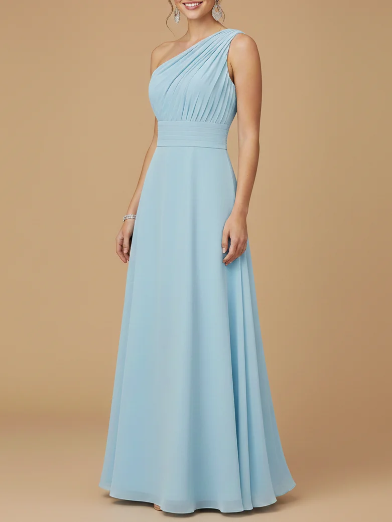 Light Blue A-line Maxi One-Shoulder Pleated Bridesmaid Dress
