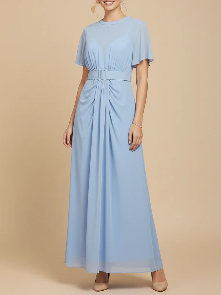 Light Blue A-line Maxi Chiffon Crew Neck Short Sleeve Bridesmaid Dress