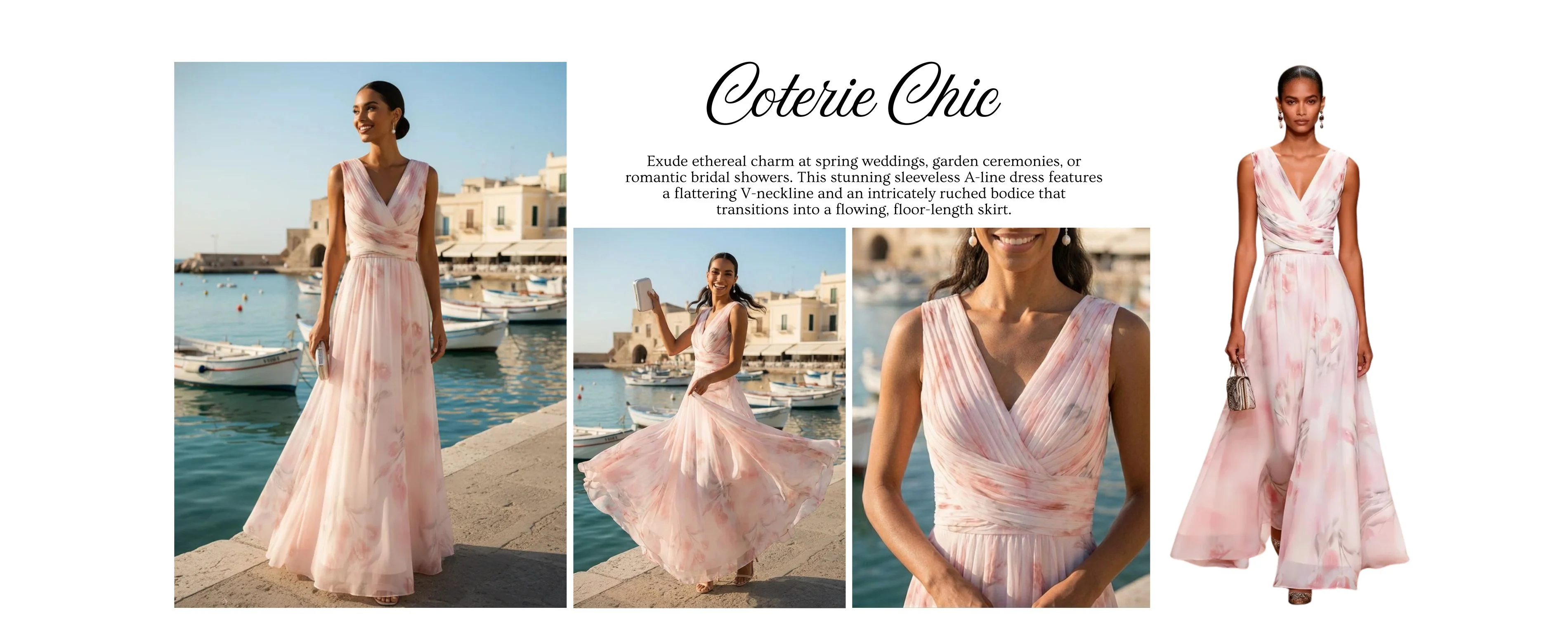 Exude ethereal charm at spring weddings, garden ceremonies, or romantic bridal showers. This stunning sleeveless A-line dress features a flattering V-neckline and an intricately ruched bodice that transitions into a flowing, floor-length skirt.