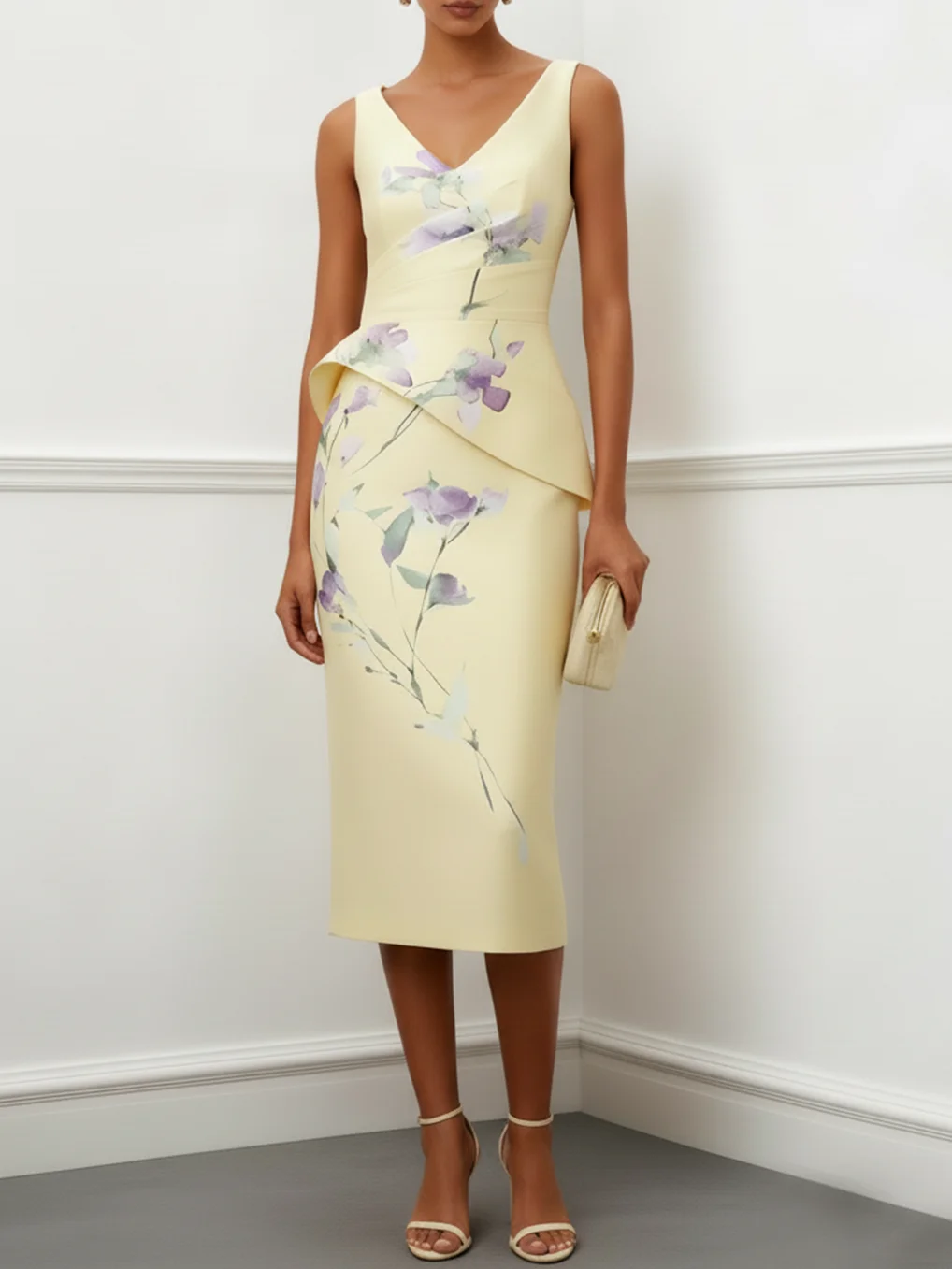Light Yellow Floral Peplum V Neck Sleeveless Sheath Midi Dress