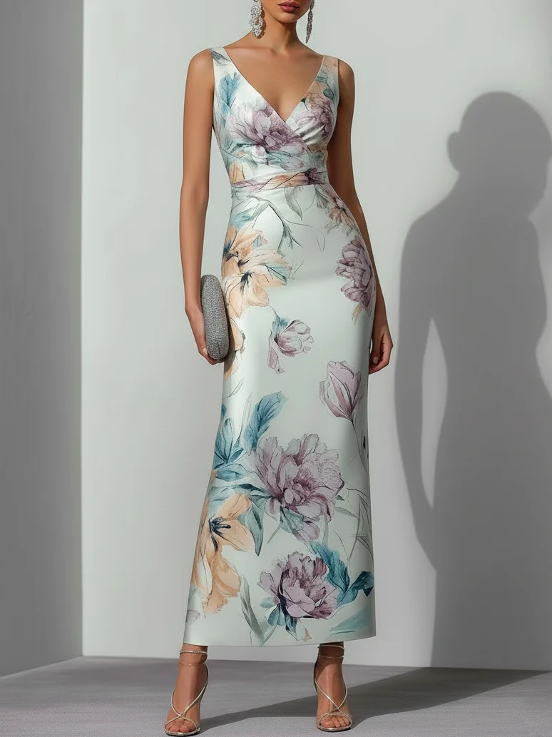 Light Green Floral Satin V Neck Sleeveless Sheath Maxi Dress