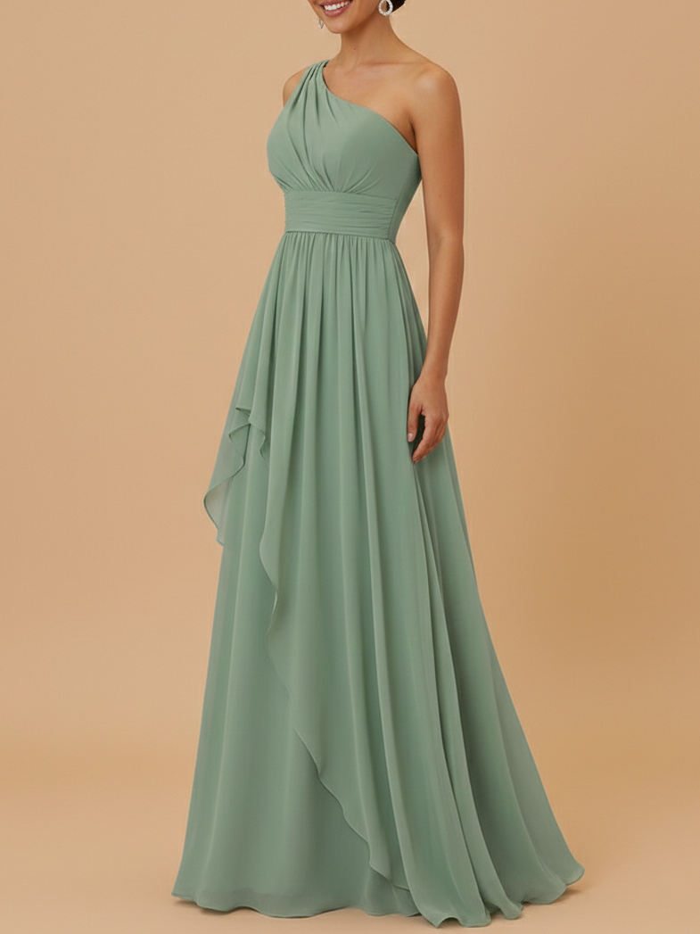 Elegant and effortless, this sage green one-shoulder chiffon bridesmaid dress features a flattering A-line maxi silhouette with soft ruching. Lightweight, flowy, and perfect for modern weddings and formal bridal parties.