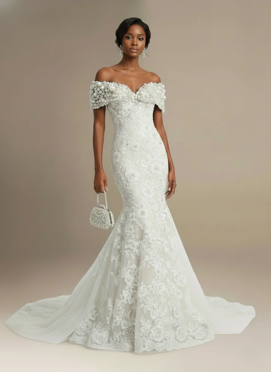 Mermaid Off The Shoulder Sleeveless Pearl Gown Elegant Bridal Dress