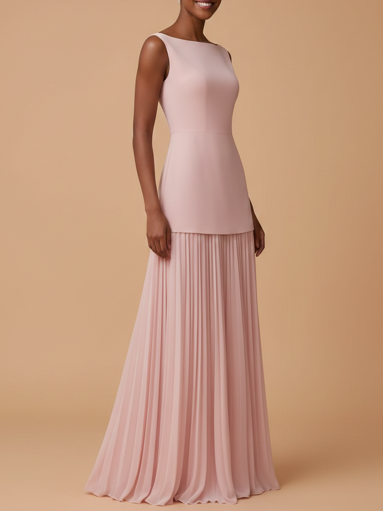 This blush pink pleated A-line maxi bridesmaid dress from Fehaute features a refined boat neck and pleated a-line silhouette. Designed to flatter and flow beautifully, it offers timeless elegance and comfort for weddings and formal occasions.