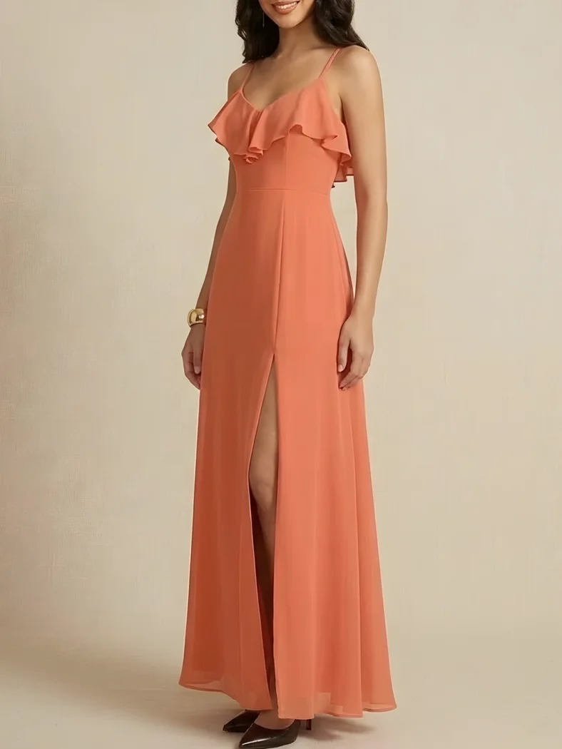 Terracotta Ruffle Chiffon Spaghetti Strap Slit Maxi Bridesmaid Dress