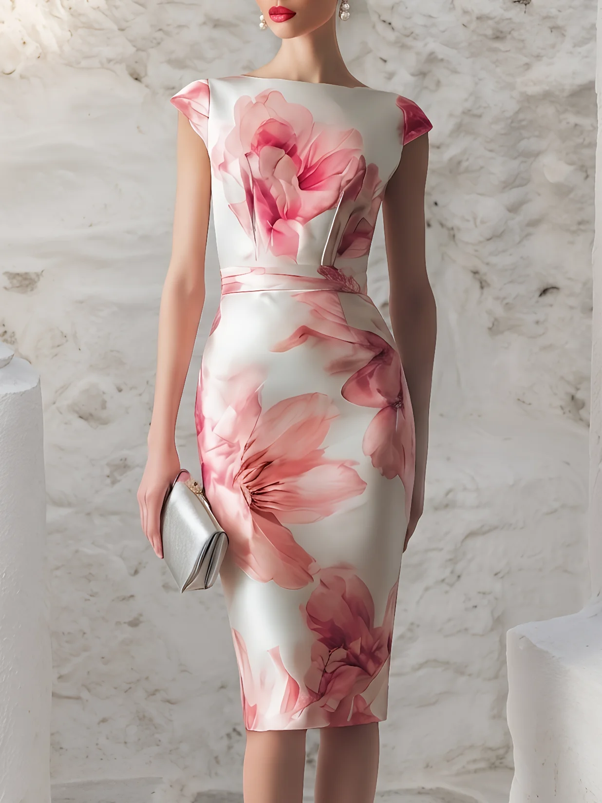 Pink Floral Satin Boat Neck Short Sleeve Sheath Midi Dress