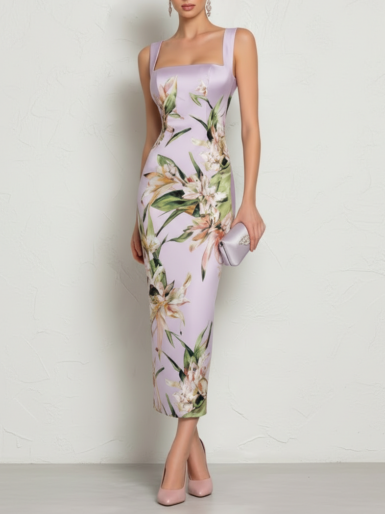 Glow at garden weddings, upscale cocktail hours, or milestone birthday celebrations. This stunning square neck sleeveless sheath features a sleek silhouette. Crafted from pink floral satin, the midi-length design offers a polished and statuesque movement.