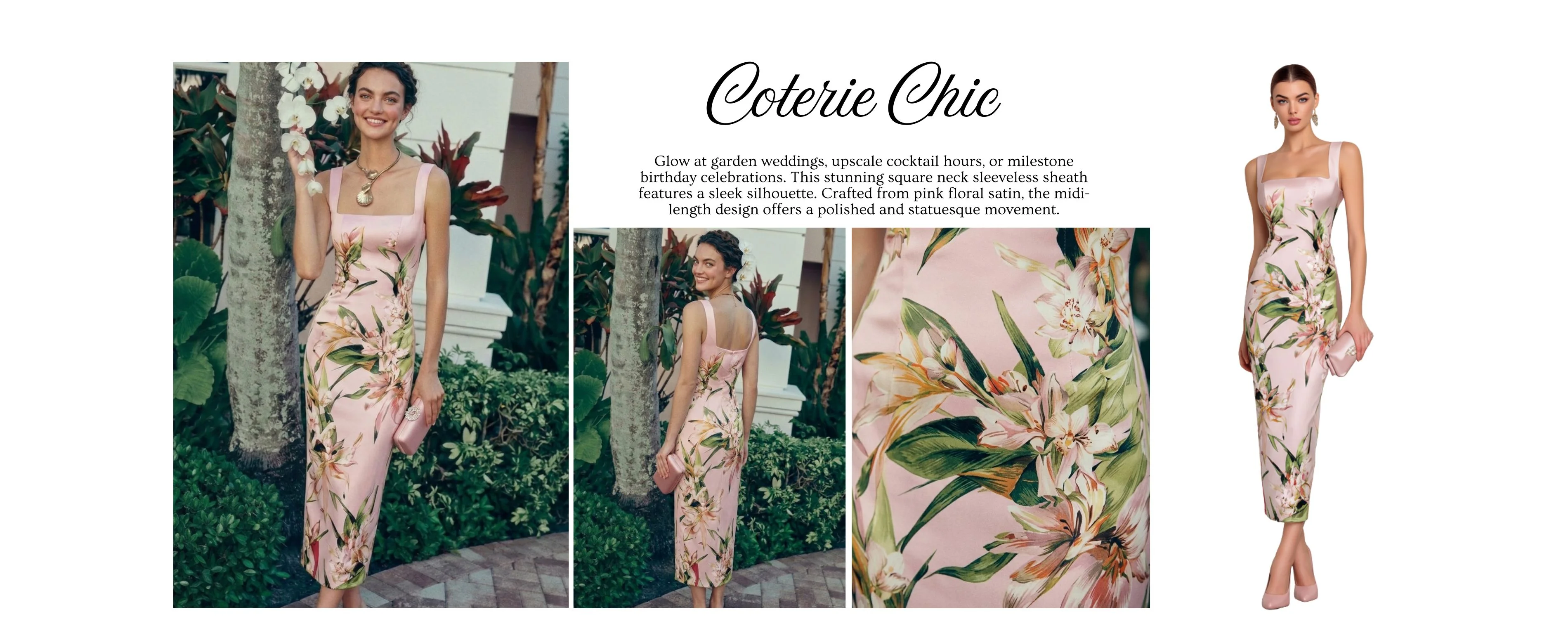 Glow at garden weddings, upscale cocktail hours, or milestone birthday celebrations. This stunning square neck sleeveless sheath features a sleek silhouette. Crafted from pink floral satin, the midi-length design offers a polished and statuesque movement.