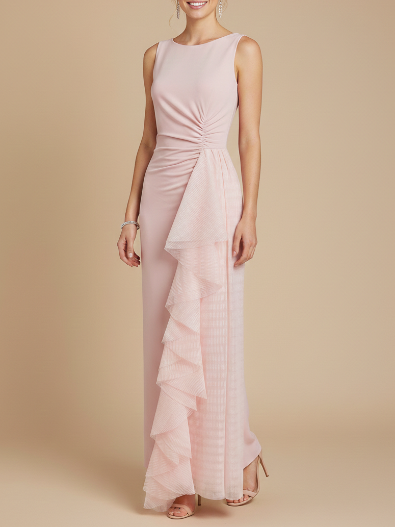 Blush Pink Sheath Maxi Ruched Sleeveless Knit and Mesh Bridesmaid Dress