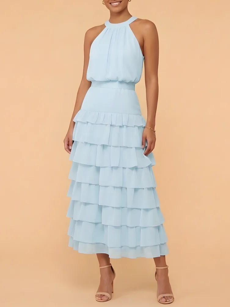 This light blue bridesmaid dress features a halter neckline and a flowing tiered ruffle maxi skirt. The soft layers create graceful movement and a romantic look, perfect for weddings, outdoor ceremonies, and elegant bridal parties.
