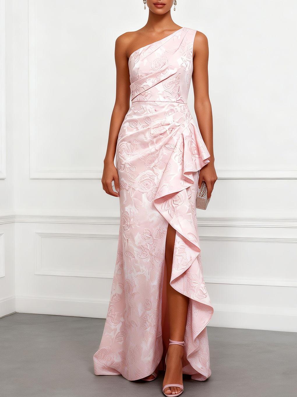 Pink Ruffled Jacquard Classic One Shoulder Sleeveless Mermaid Floor-length Gown Dress