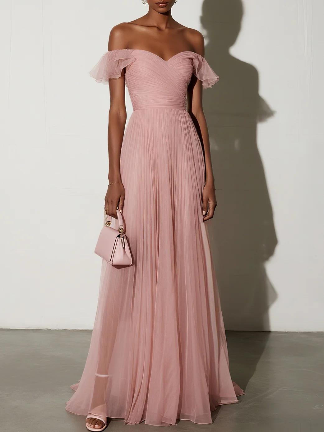 Capture every heart at proms, formal galas, or fairytale weddings. This dreamy off-shoulder gown features voluminous tulle layers, intricate pleated detailing, and romantic ruffled short sleeves. The classic A-line silhouette creates a princess-like look.