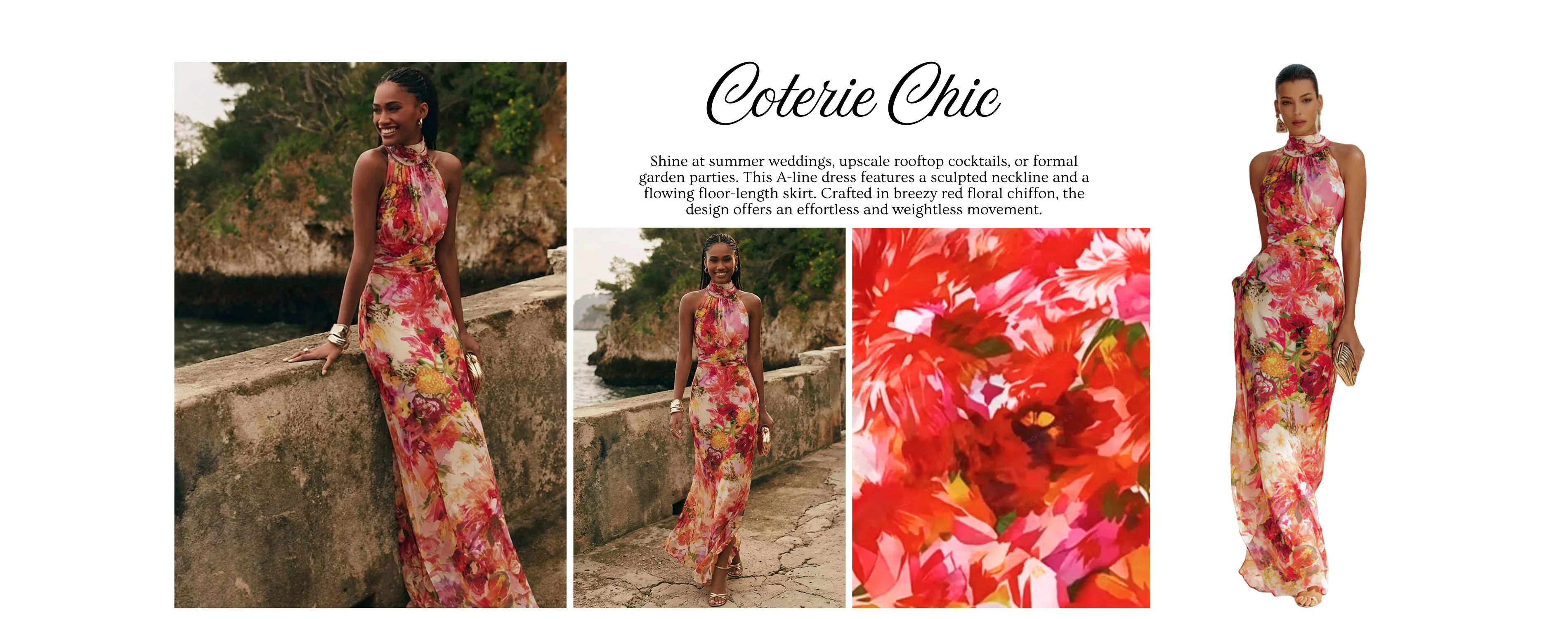 Shine at summer weddings, upscale rooftop cocktails, or formal garden parties. This A-line dress features a sculpted neckline and a flowing floor-length skirt. Crafted in breezy red floral chiffon, the design offers an effortless and weightless movement.