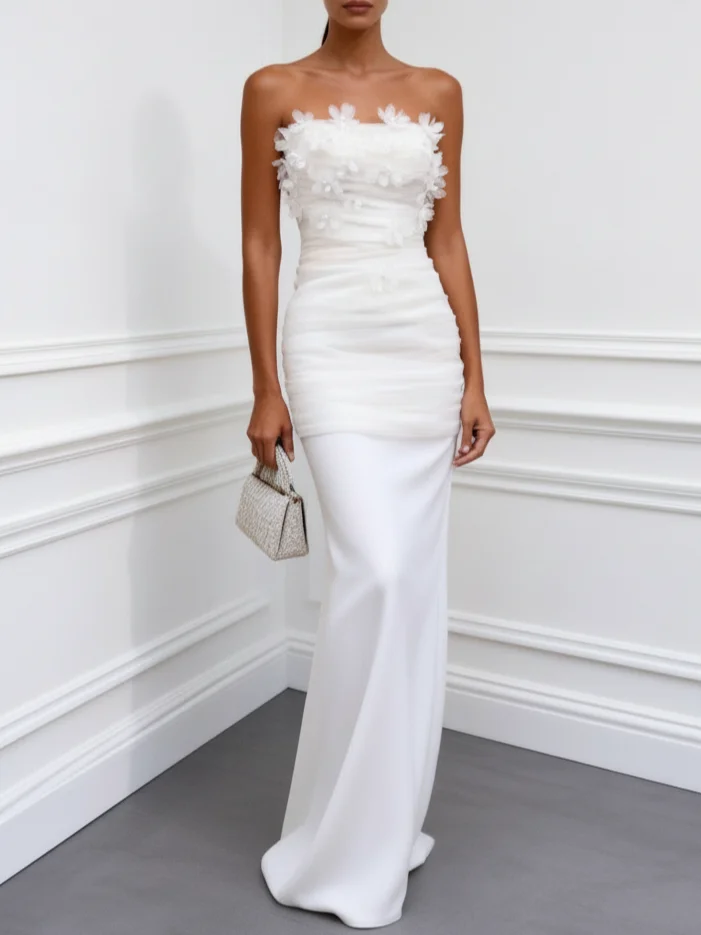 Radiate breathtaking elegance at modern ceremonies, bridal portraits, or intimate city weddings. This stunning strapless gown features a sleek sheath silhouette crafted from lustrous satin, adorned with intricate 3D floral appliqués for romantic texture.