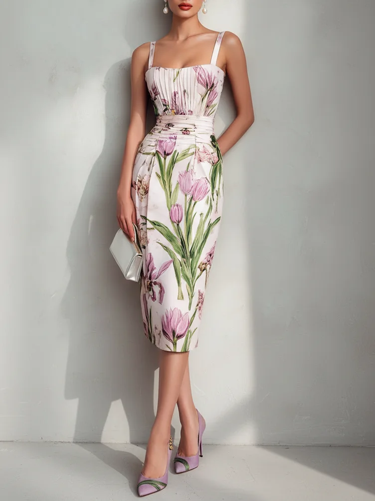 White Floral Ruched Classic Square Neck Sleeveless Sheath Midi Dress