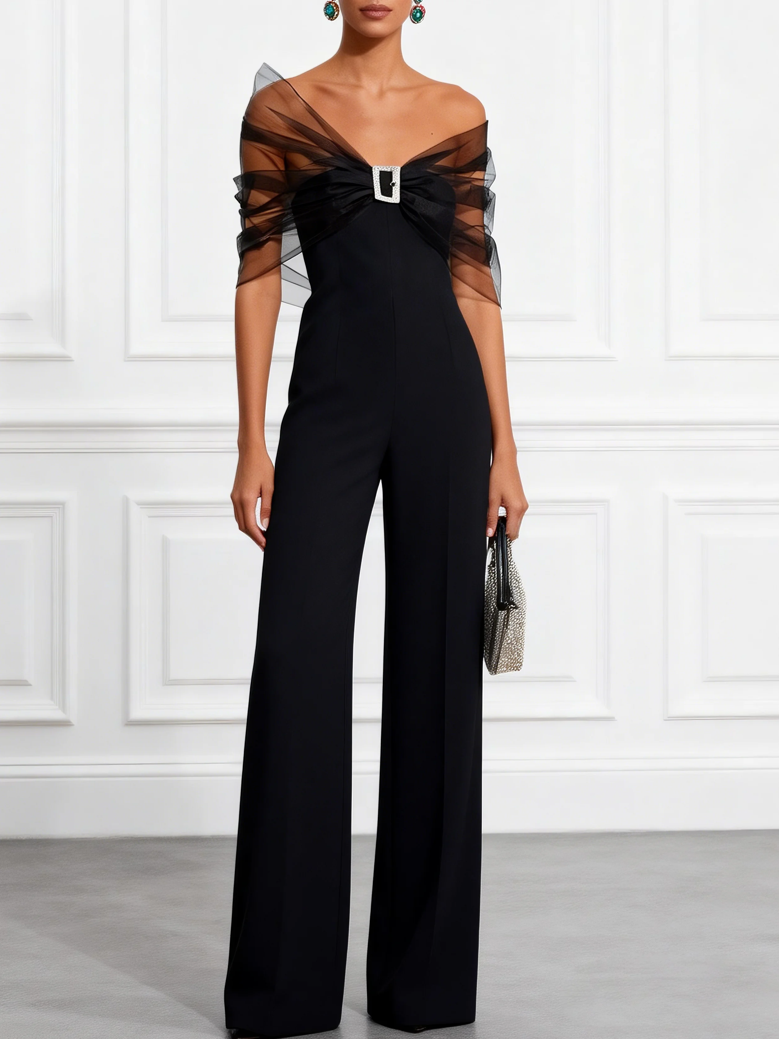 Sparkle at winter galas, sophisticated cocktail parties, or luxe evening events. This elegant jumpsuit features a plunging V-neckline and sheer mesh panels adorned with dazzling rhinestone embellishments.