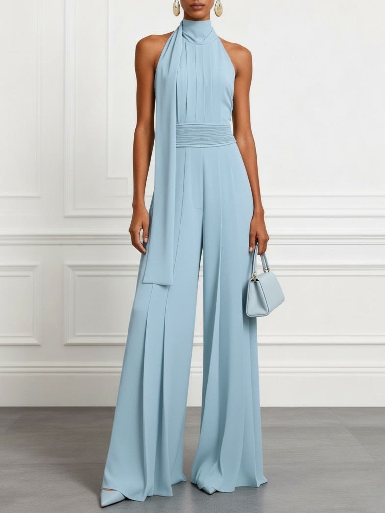Command the room at modern cocktail parties, gallery openings, or chic summer weddings. This halter mock neck jumpsuit features a beautifully ruched design. Crafted in a vibrant cyan, the wide-leg design offers a figure-flattering and statuesque movement.