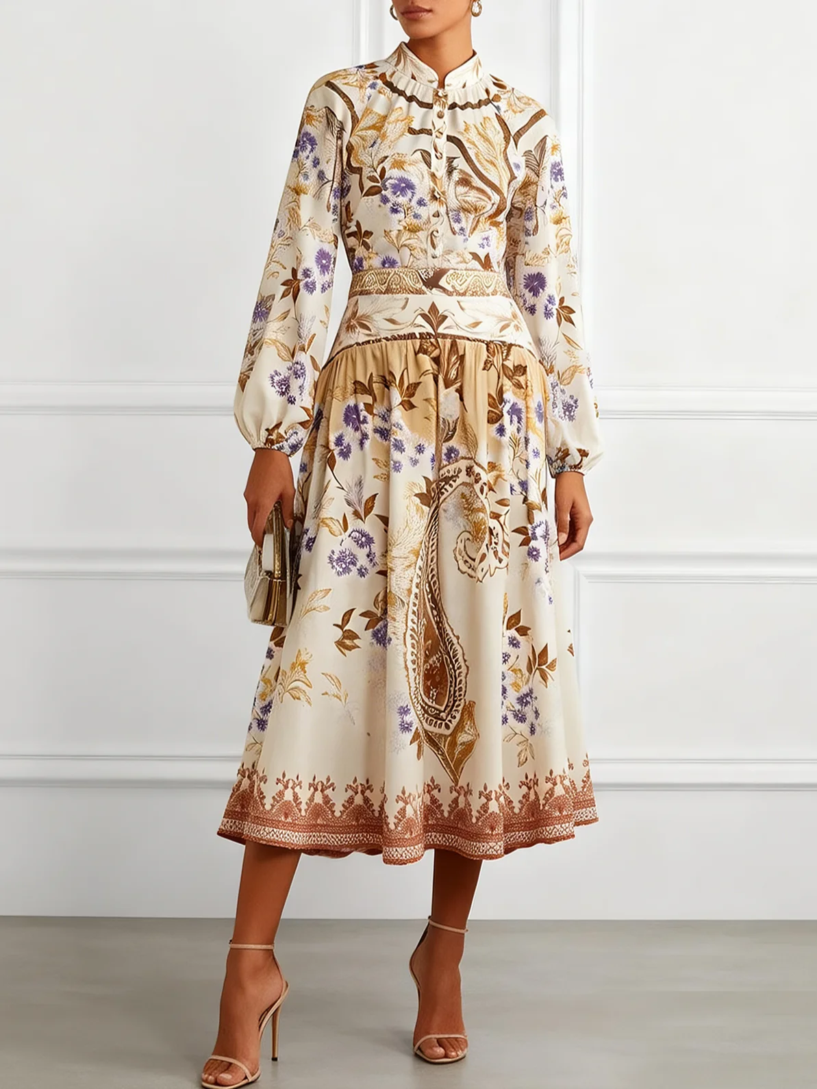 Women Khaki Gathered Mock Neck Long Sleeve Balloon Sleeve Floral Romantic Top With Skirt Two-Piece Set