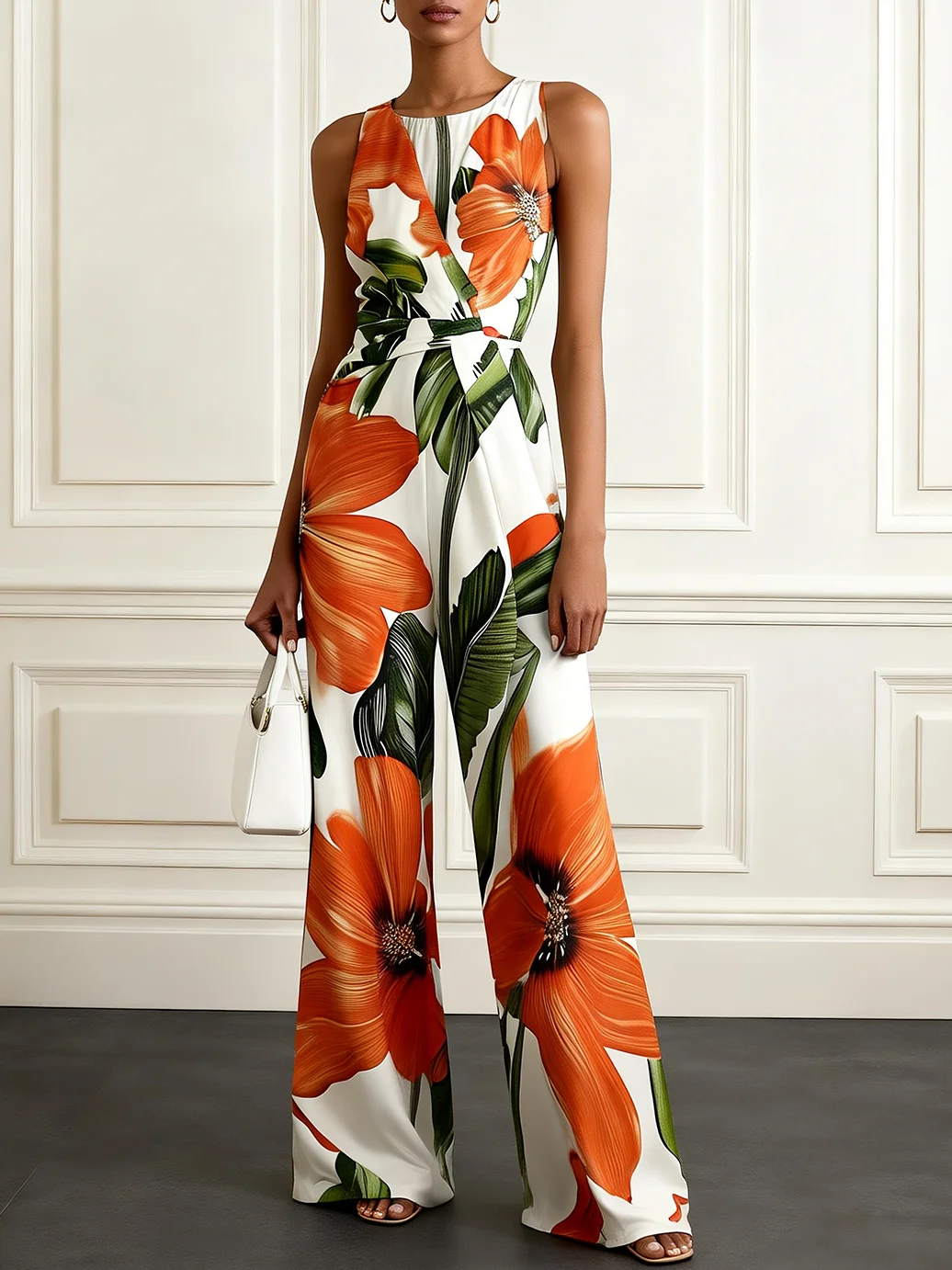 Women Orange Floral Crew Neck Sleeveless Romantic Jumpsuit