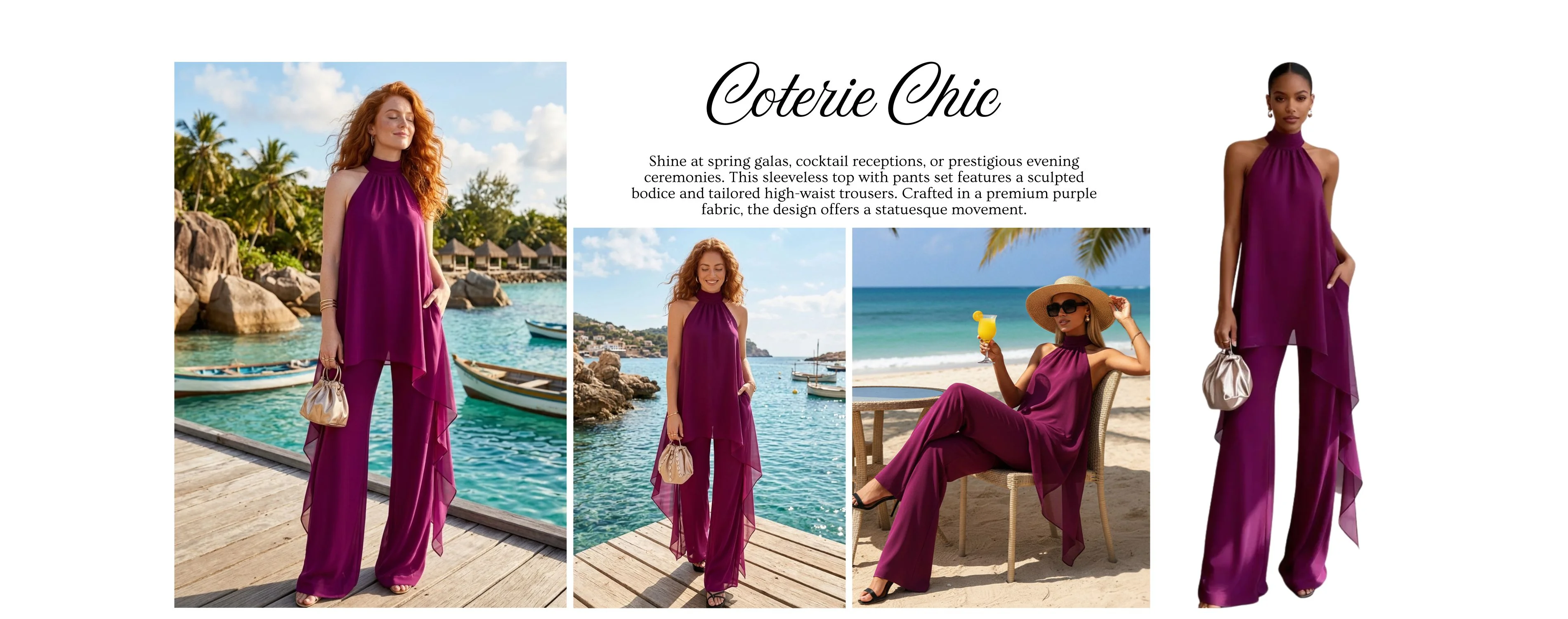 Shine at spring galas, cocktail receptions, or prestigious evening ceremonies. This sleeveless top with pants set features a sculpted bodice and tailored high-waist trousers. Crafted in a premium purple fabric, the design offers a statuesque movement.