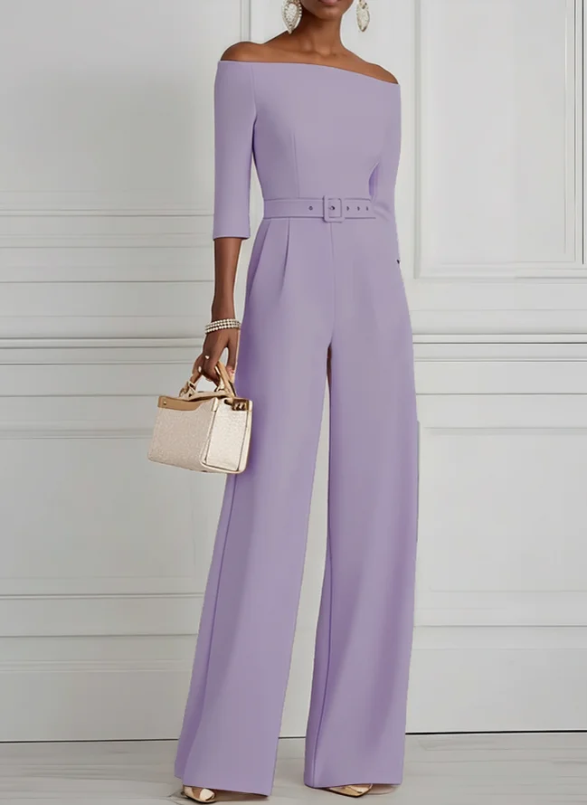 Women Purple Off The Shoulder Half Sleeve Dressy Jumpsuit With Pockets