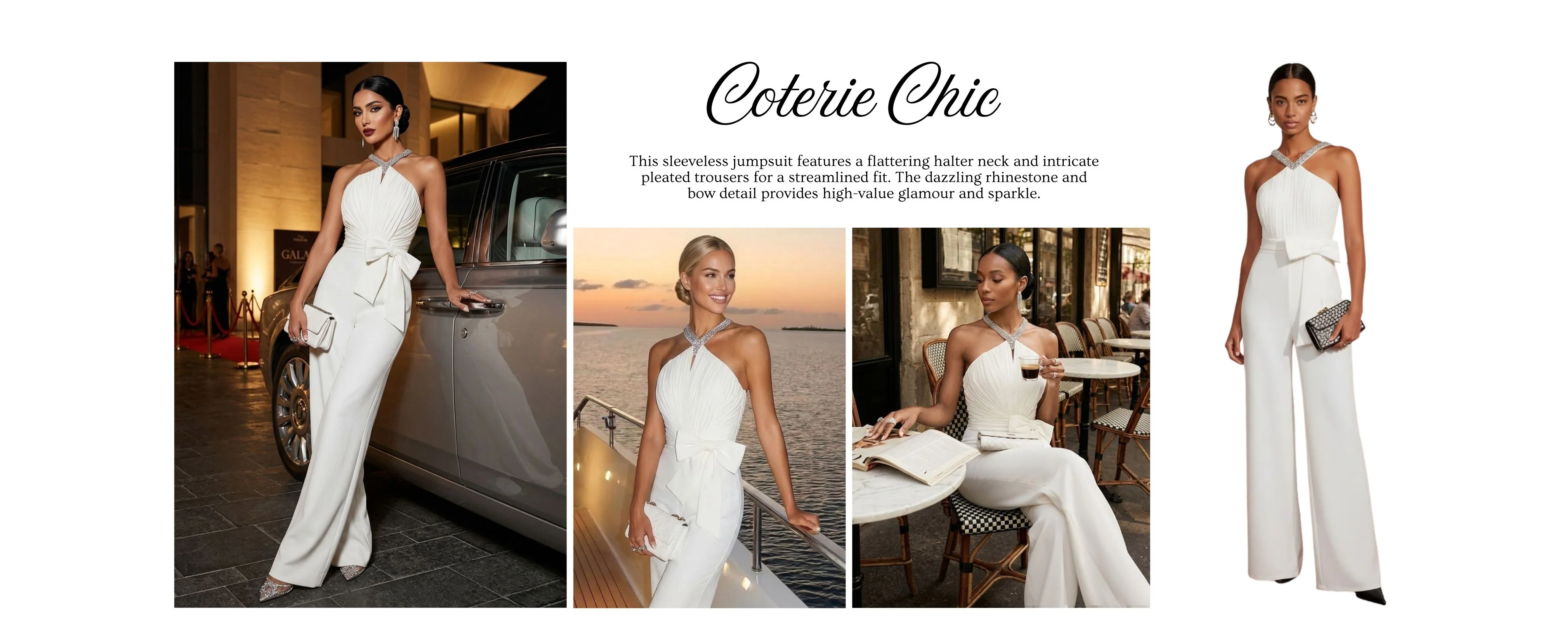 This sleeveless jumpsuit features a flattering halter neck and intricate pleated trousers for a streamlined fit. The dazzling rhinestone and bow detail provides high-value glamour and sparkle.