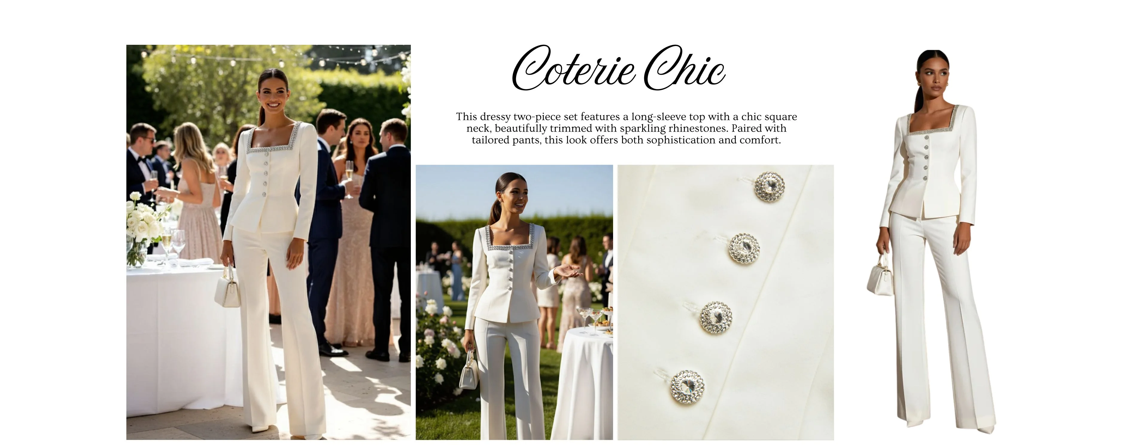This dressy two-piece set features a long sleeve top with a chic square neck, beautifully trimmed with sparkling rhinestones. Paired with tailored pants, this look offers both sophistication and comfort.