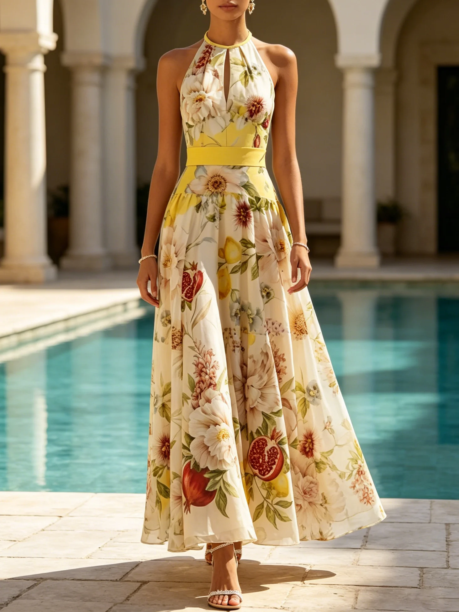 Yellow Floral Chiffon Halter Neck Sleeveless A-Line Maxi Dress