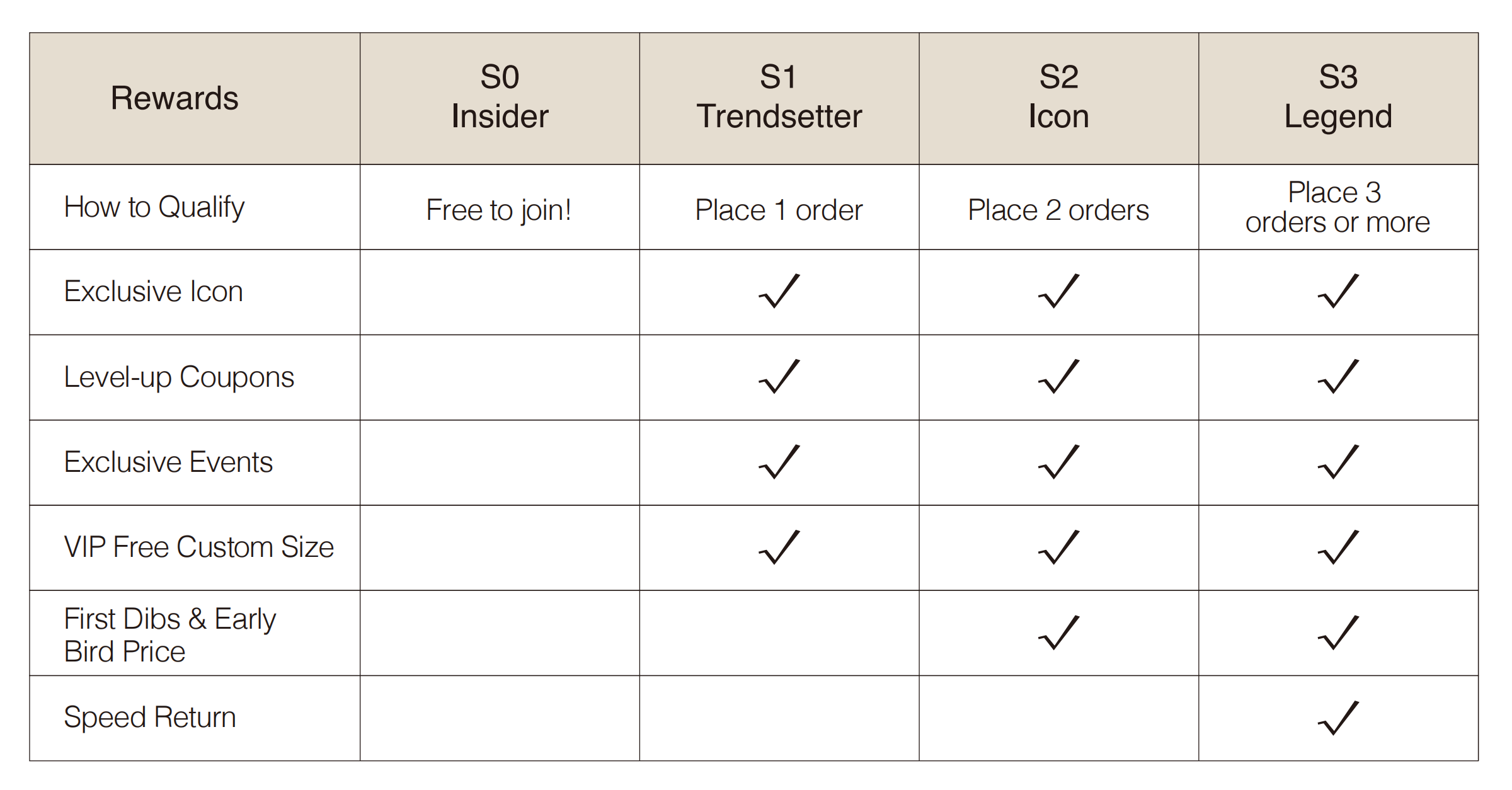 · After 12 months of membership, once you have reached tier S1 (Trendsetter) Level, you will be eligible to become a lifetime member. Please note that your membership tier is based on the number of eligible purchases or amount spent in the last 12 months.